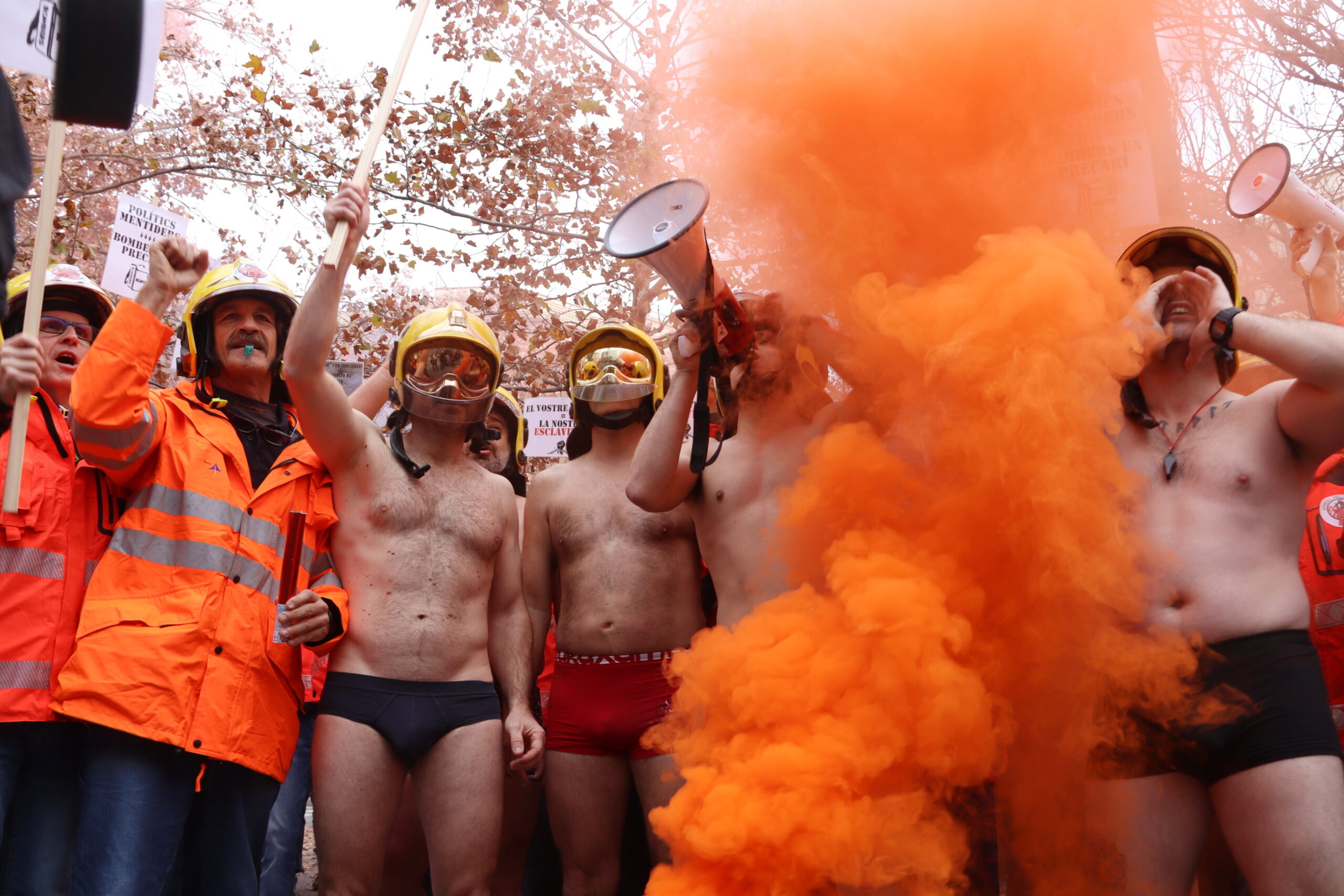 Bombers voluntaris s’han plantat a la conselleria amb els molts petards que caracteritzen les protestes d’aquest col·lectiu, però aquesta vegada han volgut explicitar que es troben “desprotegits” amb una acció simbòlica en què alguns d’ells s’han quedat despullats -en calçotets i amb el casc de bomber posat-, mentre els seus companys alçaven pancartes i bengales.