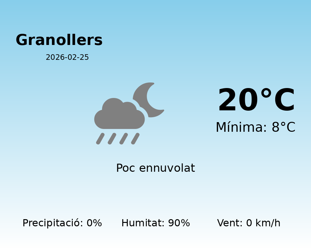 Avui, 25 de febrer de 2026, el temps a Granollers es presenta amb unes condicions força estables i agradables per a aquesta època de l’any. A continuació, us oferim la informació detallada sobre el pronòstic meteorològic per a la jornada d’avui.