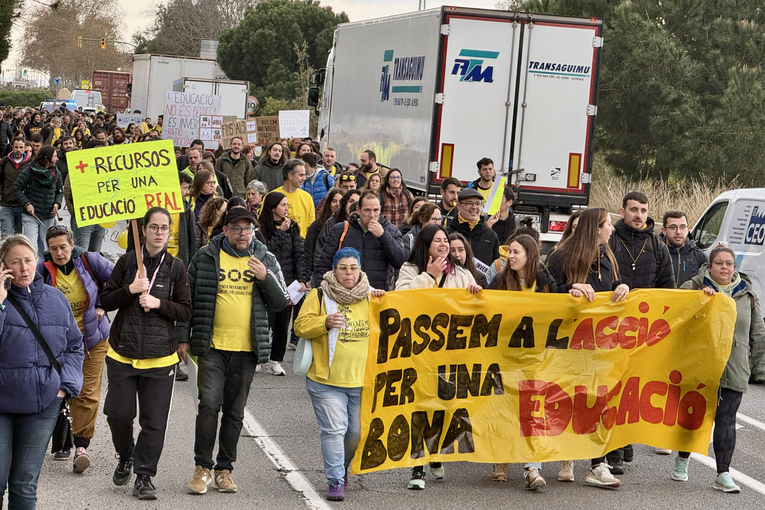 D’altra banda, mig miler de persones, acompanyats d’una quarantena de tractors de Revolta Pagesa, s’han concentrat a Girona, davant del pavelló de Fontajau. Els manifestants, docents i pagesos, simulen una classe, amb pupitres i una pissarra.