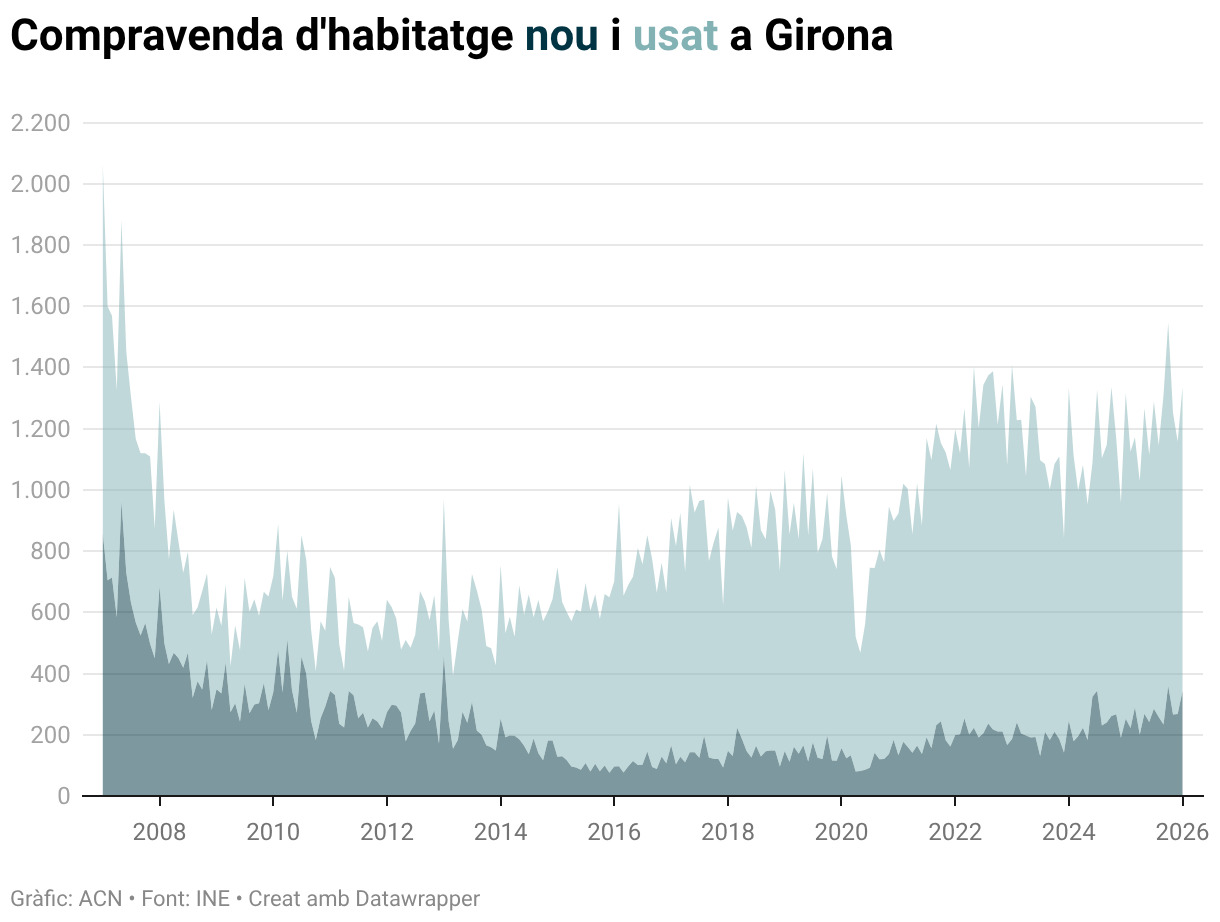 Per demarcacions, Barcelona va concentrar la major part de les operacions amb 6.352 compravendes al gener, el que representa prop del 65% del total a Catalunya. A Girona, la compravenda d’habitatges es va situar en 1.335 operacions, mentre que Tarragona en va registrar 1.442, amb un volum lleugerament superior. Ambdues demarcacions mantenen un pes rellevant dins del mercat català, tot i que a una distància considerable de Barcelona. Finalment, a Lleida es van comptabilitzar 636 transaccions, el volum més baix de les quatre demarcacions.
